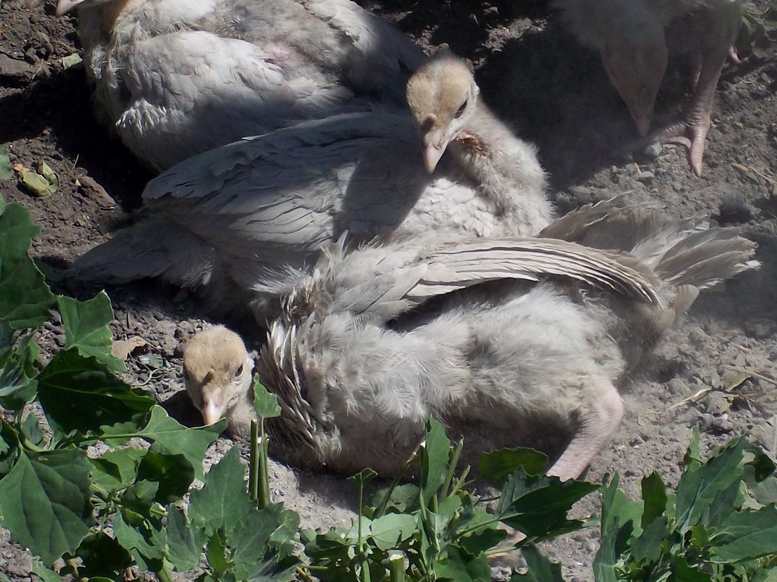 Предыдущие две недели стояла очень сильная жара. Температура днем поднималась до +40С и выше. Индюшат приходилось с 12 до 16 часов убирать из вольера в тень птичника (огородила дополнительно небольшой участок). Иначе они могли перегреться и заболеть. Птицы не возражали против таких мер и сами пытались найти тенек, но в вольере негде спрятаться, деревьев и кустов нет.