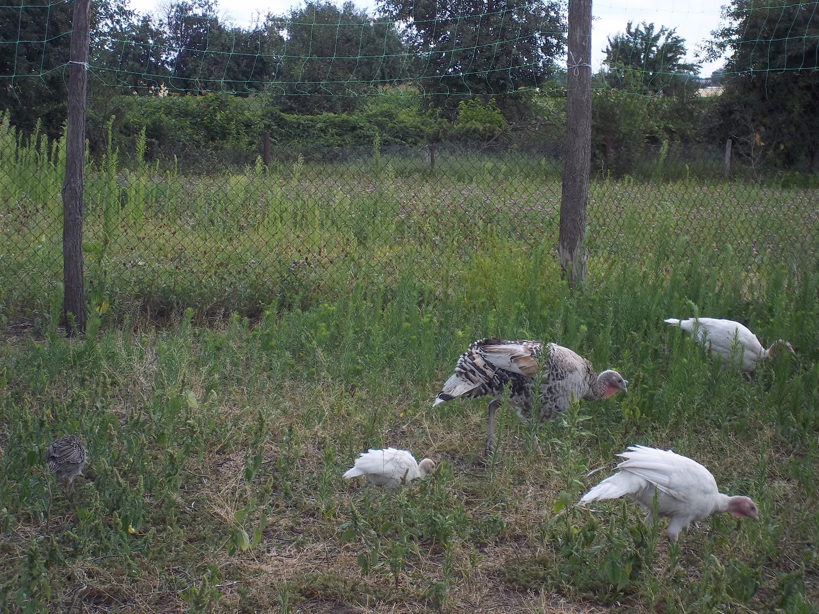 Через какое-то время эта индюшка обнаружила вольер, в котором гуляли индюшата и первая индюшка. Она перестала есть и пить, днями стояла возле сетки вольера и наблюдала за индюшатами. От нереализованного материнства таяла на глазах. Я решила запустить индюшку в вольер, не смотря на существующее мнение, что птицы не могут делить меж собой птенцов, и как правило жестоко деруться.